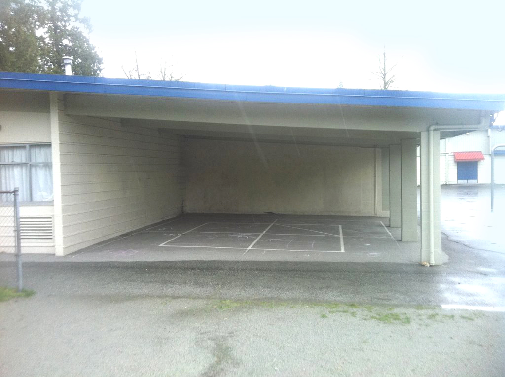 Location: Along the south wall, located between just past the staff room windows to just before the library windows (approximately 56’). Please note that it does not cover the staff room or library windows at all. For the width, it could stop at the planter which would be approx. 23’ from the roof line (24’ from the wall). This is a well exposed area. Both sides are nicely separated by pillars, before the windows.
